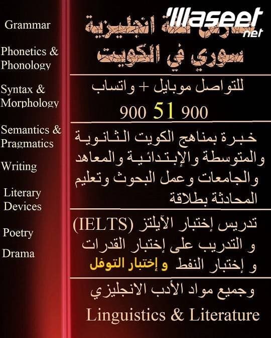 مدرس إنجليزي سوري خـبـرة بمناهج الكويت الـثـانـويـة والمتوسطة والإبـتـدائـيـة والمعاهد والجامعات وعمل البحوث والمحادثة و Linguistics& Lite